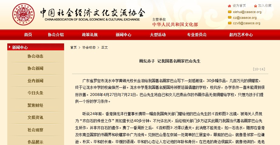 广东省罗定市泷水中学黄锦光校长含泪给我国著名画家巴山写下一封感谢信,30多幅作品,几百万元的捐赠款,终于让泷水中学的校舍焕然一新。泷水中学是我国著名爱国将领蔡廷锴倡建的学校,校风好,办学条件一直未能得到很好改善。2008年4月27日与7月21日,巴山先生将自己和女儿巴燕合作的书画作品无偿捐赠给学校,只想为孩子们提供一个好的学习条件。