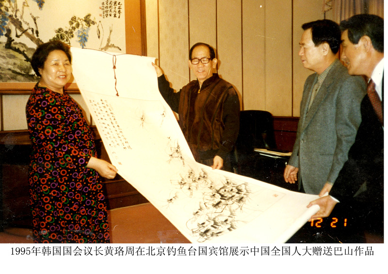 1995年韩国国会议长黄珞周在钓鱼台国宾馆展示全国人大赠送的巴山画作。